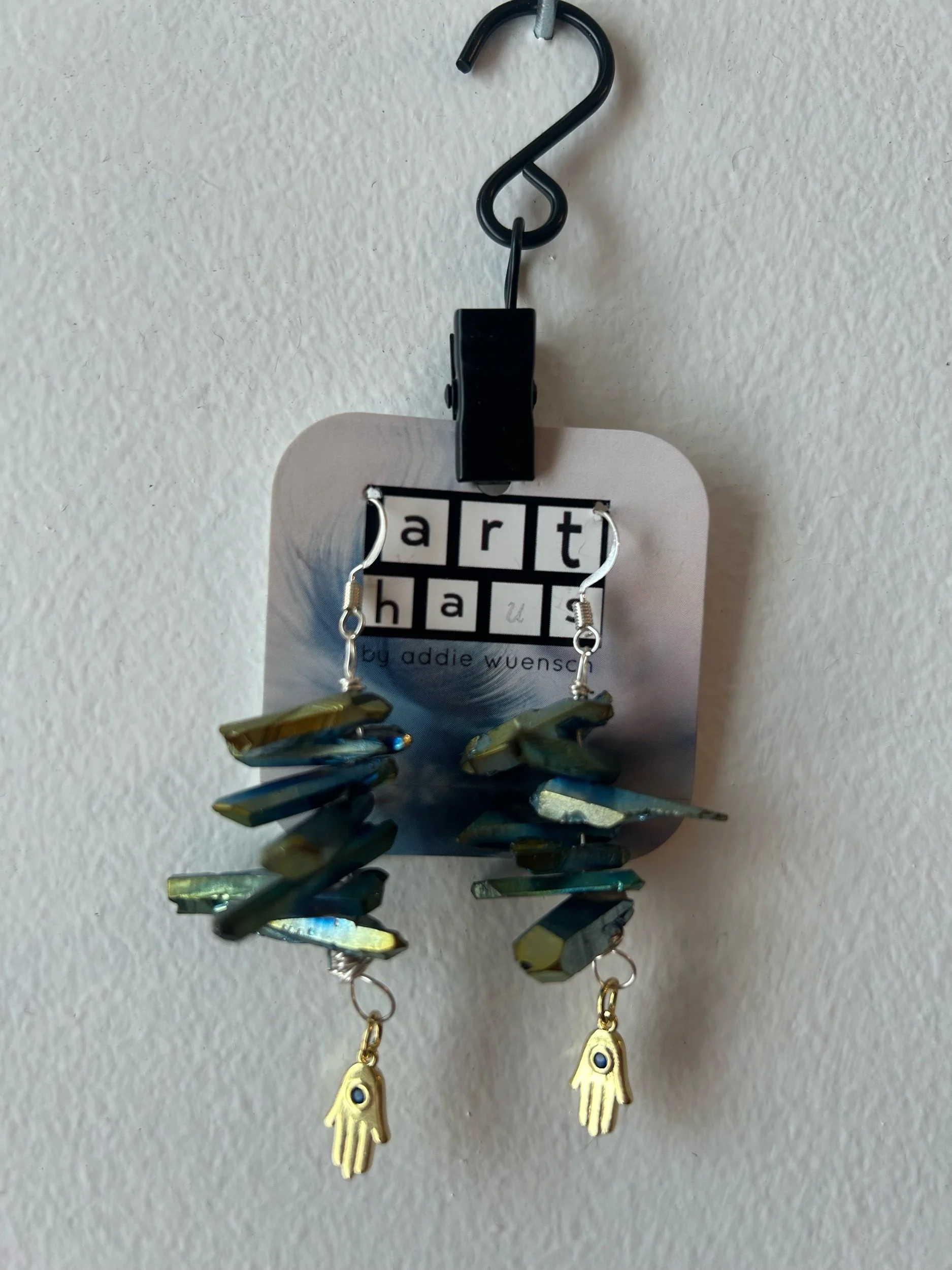 shop jewelry and graffiti purses › Hamsa Aura Quartz Earrings Image 1 of 1 Hamsa Aura Quartz Earrings $25.00 Add To Cart Added!