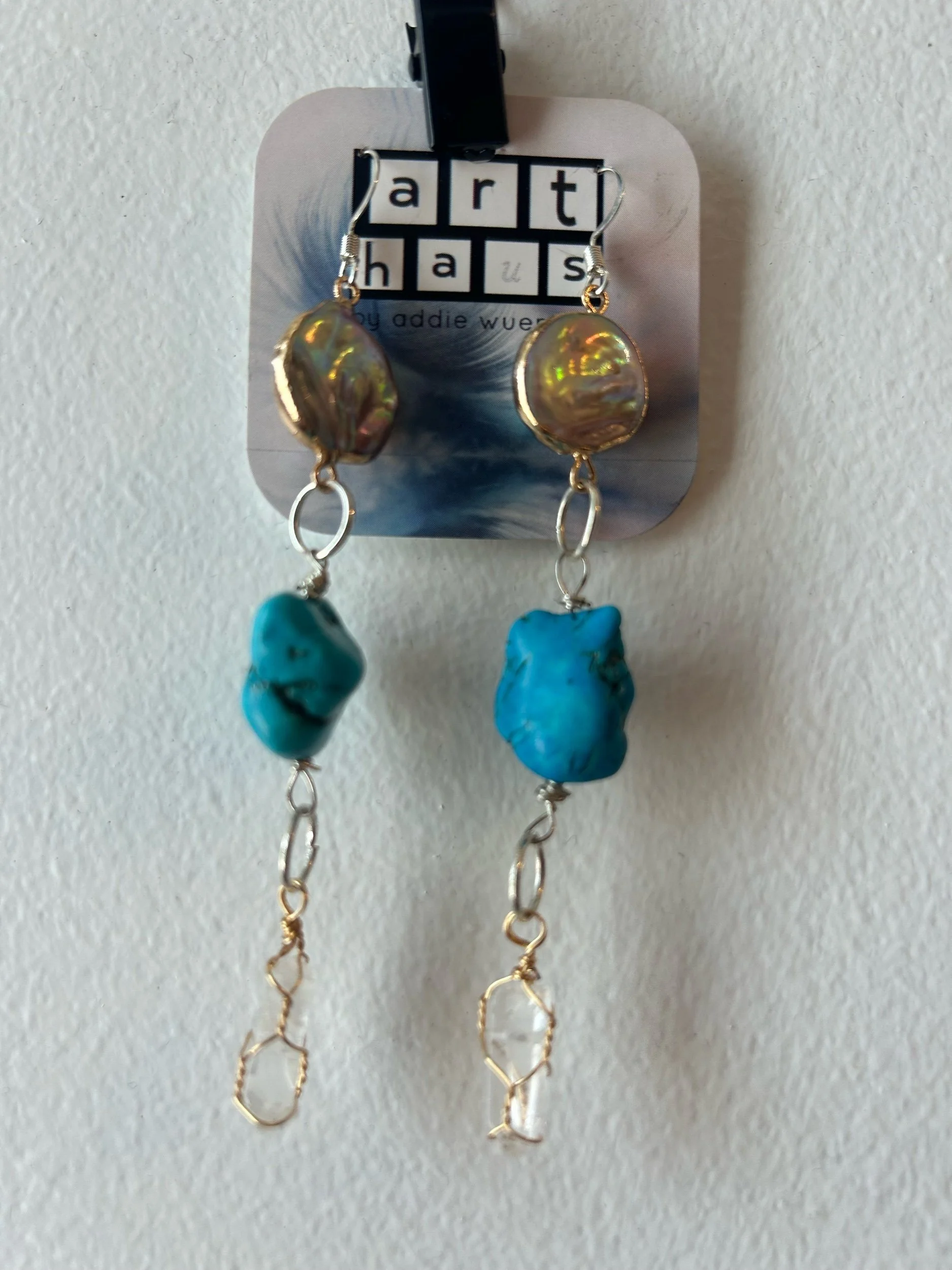 shop jewelry and graffiti purses › Abalone Shell Turquoise Quartz Earrings Image 1 of 1 Abalone Shell Turquoise Quartz Earrings $25.00 Add To Cart Added!